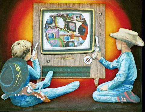 The cowboy brothers prepare to shoot it out with a colorized TVscape. This was the first use of digital photography in my artwork. This is the first limited edition.